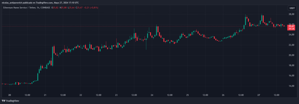 El token ENS permite a sus poseedores votar en decisiones relacionadas con el funcionamiento del protocolo. Además, su cotización es volátil debido a la oferta y demanda en los exchanges. En la última semana, el precio de ENS ha mostrado una variación significativa, como se puede observar en el siguiente gráfico proporcionado por TradingView: