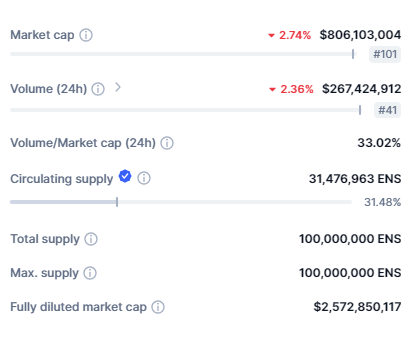 Otro aspecto a tener en cuenta es la naturaleza inflacionaria del token ENS. Según datos de CoinMarketCap, aún falta por emitir más de la mitad del suministro total de ENS. Esta característica podría ejercer presión a la baja sobre el precio del token a largo plazo.